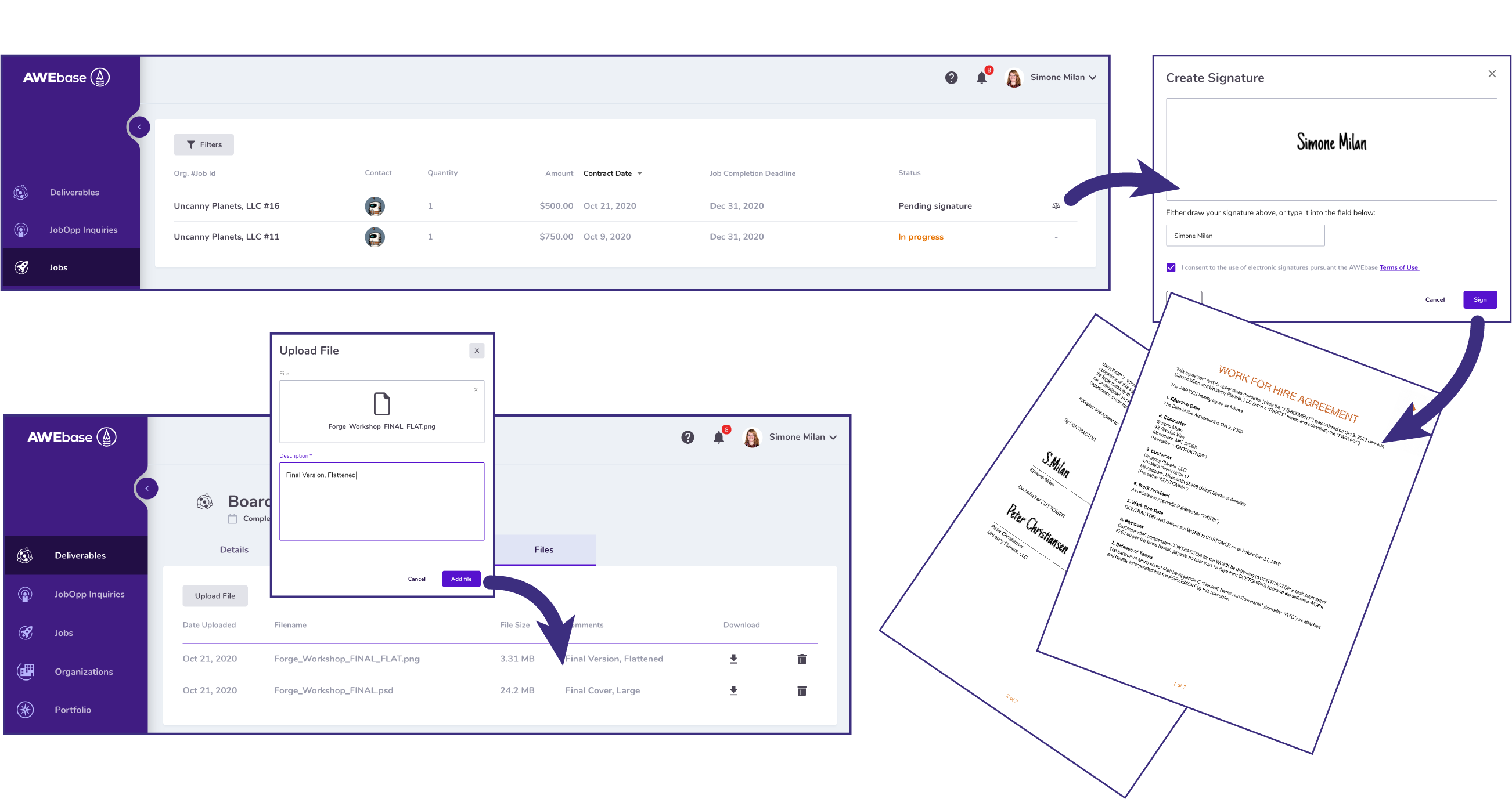 Slide AWEbase® charges neither you nor your client a fee or commission on your work! WAIT, HOW DOES THIS WORK? AWEbase® customers use our software to manage contractor projects and jobs. As a freelance contractor, you may be invited to AWEbase® by one or more of your clients to engage in the following: Opening a contributor AWEbase® account is free. No credit card is required. Job Opportunities Digital Asset Delivery Deliverable Review Contract eSigning