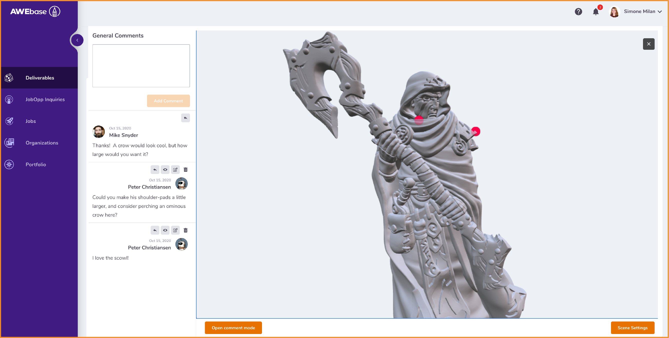 AWEbase® allows 3D modellers to upload their digital work-in-progress to be displayed in our 3D review and commentary interface. STL, OBJ, and FBX models supported. Does your work involve unique files types or no digital files at all? No problem! You'll be able to share any form of file, reference, update, and commentary with your client using the General Work interface. AMAZING FEEDBACK ANDCOMMUNICATION