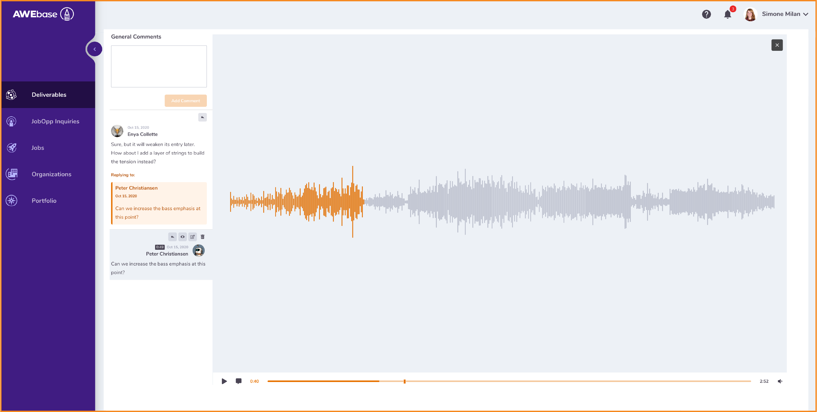 Slide Images Video Text and PDF Audio 3D-Files General Work Are you an artist, photographer, graphic designer, or other image provider? You'll love the AWEbase® image review interface allowing you and your client to mark-up, comment, and discuss your work-in-progress. Do you create motion graphics, visual effects, supply video/film editing, or similar? The AWEbase® video review interface allows your client to give feedback and visual markup frame by frame. Writer, editor, journalist, translator? AWEbase® allows you to upload either PDF or .docx files, enabling your to comment and visually markup your work directly in the Deliverables interface. Do you supply clients with music scores, voice acting, audio editorials or sound effects? You'll love the simple and effective timeline tool in AWEBase® to share feedback with your clients.